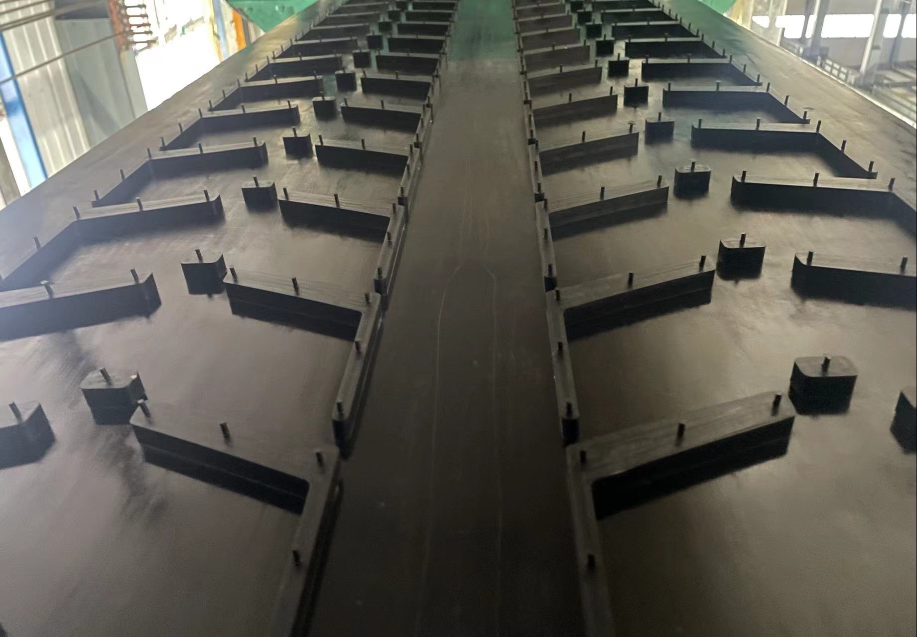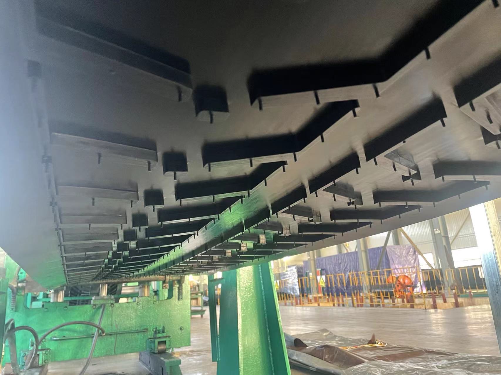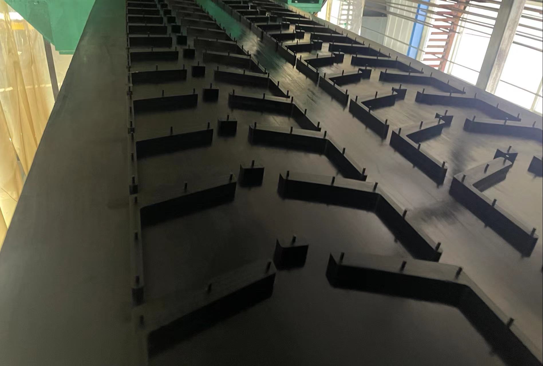 ■ 根據(jù)輸送機(jī)系統(tǒng)要求的帶寬、強(qiáng)度、物料特性,決定花紋圖案和凸塊的長、寬、高度、角度、和間隔